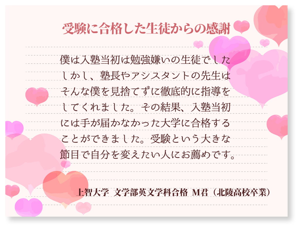 多くの合格した生徒達や保護者の方々から沢山の感謝の言葉を頂き嬉しい限りです。ここで全てを紹介することができませんが、本当に合格されたことが嬉しいですし、こちらこそ素晴らしい人生の時期に共に努力できたこと本当に感謝の気持ちで一杯になります。今後の糧にして益々頑張っていきます。また、英秀塾から合格された生徒の多くが、講師になってくれていることも嬉しいし、心強く思っている状況です。