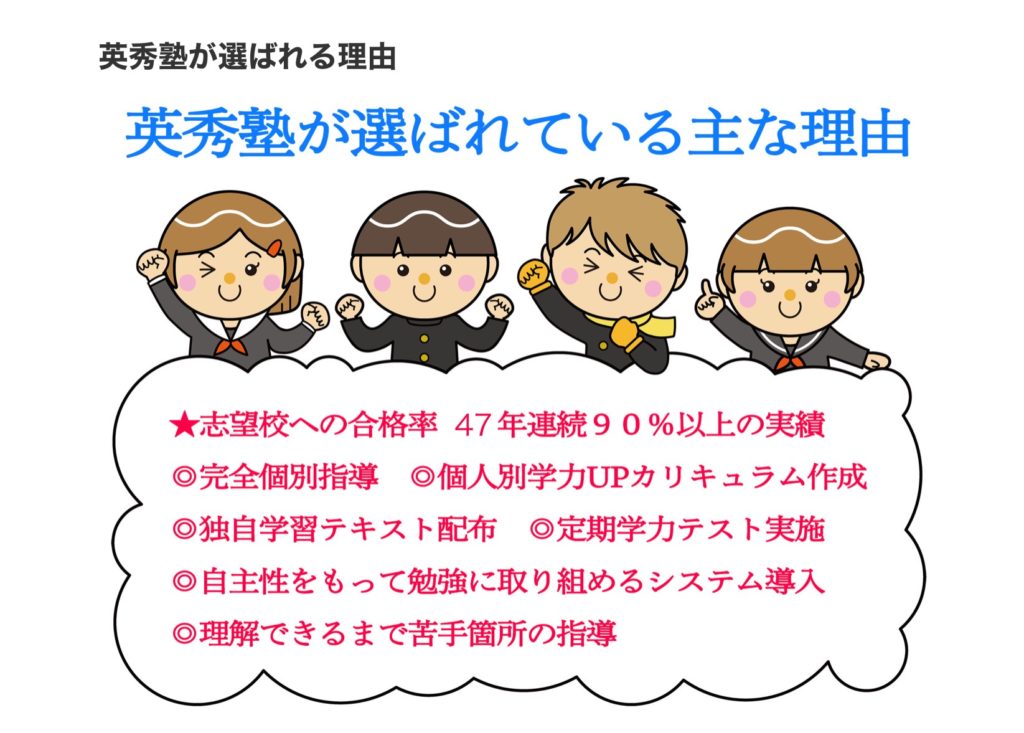 英秀塾が、受験生や生徒、保護者の方々に選ばれている主な理由で一番多いのは、志望校への合格率が44年連続90%以上の実績です。それ以外にも入塾面談の時にきっちり説明させて頂いている上記のような学習方法や学習環境に納得賛同し選んで頂けているのも嬉しいです。
