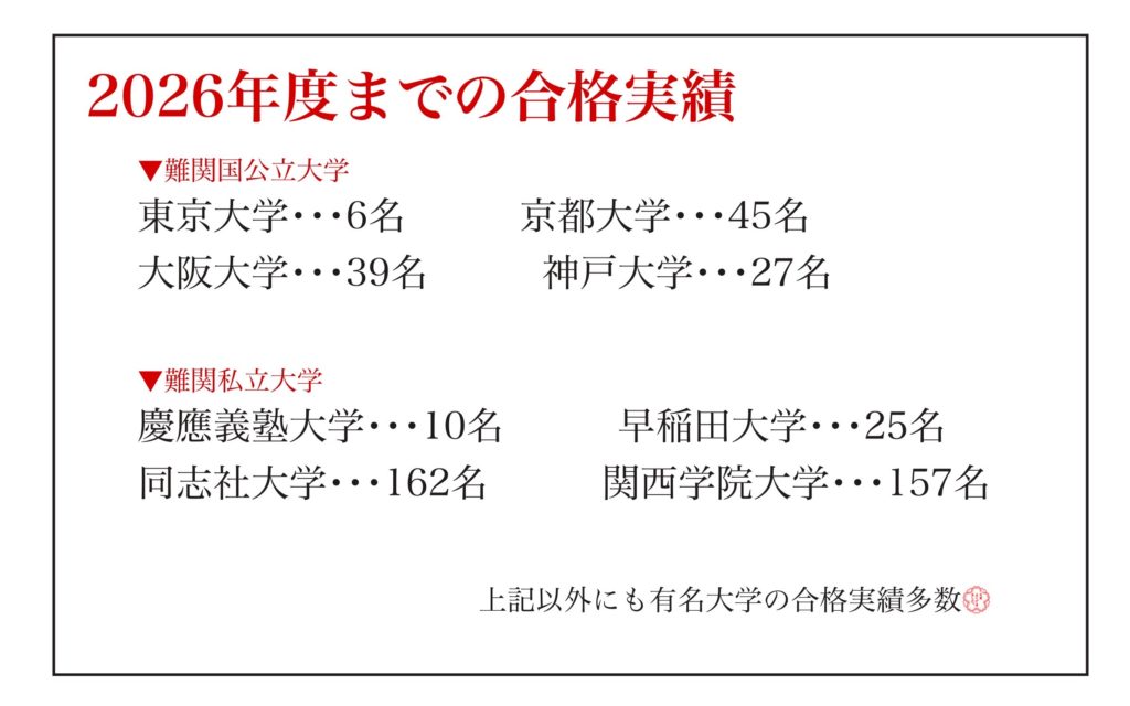 英秀塾で受講されていた生徒達の2023年までの主な大学受験や高校受験での合格実績です。上記は超難関の有名大学を掲載させて頂いております。上記以外の合格された大学や高校はコチラに掲載させて頂いておりますのでご参考にして頂ければと思います。 ≫ 今までの合格実績